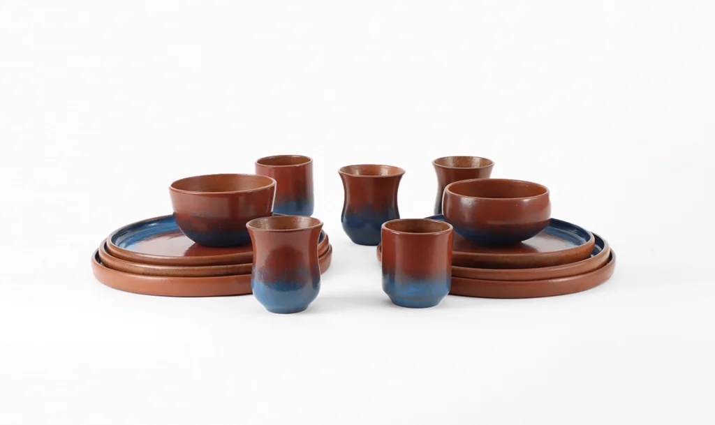 An elegant and functional set that enhances any table with the natural beauty of earthenware. It has a glazed finish and includes a dinner plate, hors d’oeuvre plate, soup bowl and glass. The special thing about this piece is the use of natural engobes such as indigo, a plant whose harvest is seasonal, which makes it more complex and valuable.