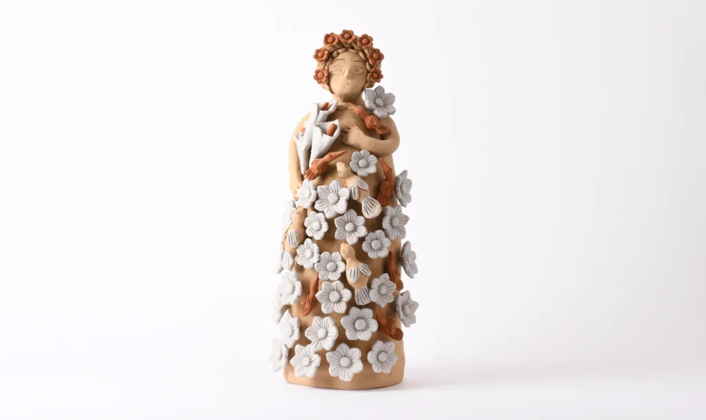 Tender clay doll modeled entirely by hand, without molds. It is decorated with the pastillage technique, which adds delicate gannets and flowers in light blue tones. A charming piece to give a handmade and warm touch to a niche or shelf.