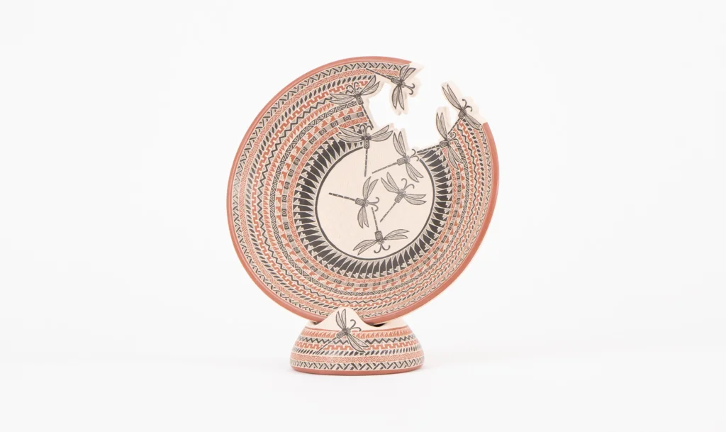 Large ceramic plate from Mata Ortiz, Chihuahua, decorated with dragonflies in reddish tones. A special piece that enhances any space and looks wonderful as a centerpiece.