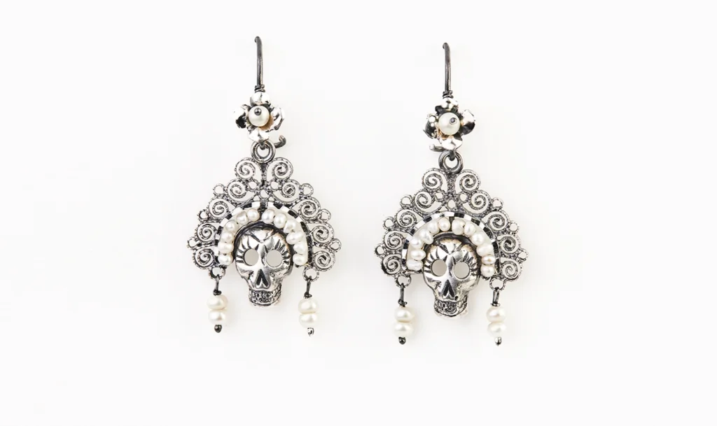 A pair of silver filigree earrings with delicate skulls adorned with small pearls on the sides. A refined accessory that will undoubtedly make you stand out, a unique jewel that combines tradition and Mexican symbolism.