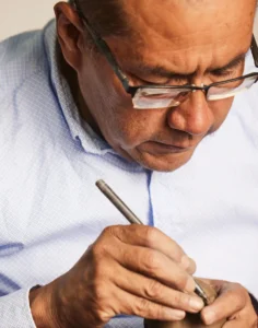 The subject of death has had different treatments as a result of complex historical processes.and sociocultural traditions of Mexico, culminating in the twentieth century with the political satire of José Guadalupe Posada. Carlomagno Pedro Martínez (San Bartolo Coyotepec, 1965), heir to the black clay pottery tradition that the inhabitants of San Bartolo Coyotepec in Oaxacahan have maintained for many generations, deeply understands the role of rituals surrounding death in the construction of Mexican identity. A maker of surreal and macabre images, Carlomagno is dedicated to shaping and representing mosaics of the indigenous cosmovision, as well as diverse mestizo traditions through clay. The image of a black ear of corn and its kernels replaced by skulls refers us to the agricultural cycle of corn, associated with life and death. In contrast, the piece Notes on the Origin celebrates life in its most mundane manifestations and the simultaneous and perpetual mourning against death in our daily lives, a reminder that we face every Day of the Dead. Both pieces on display, we invite you to get to know the work of master artist Carlomagno Pedro Martínez, as well as various pieces of material culture from the states of Oaxaca and Chihuahua at De Corazón México.