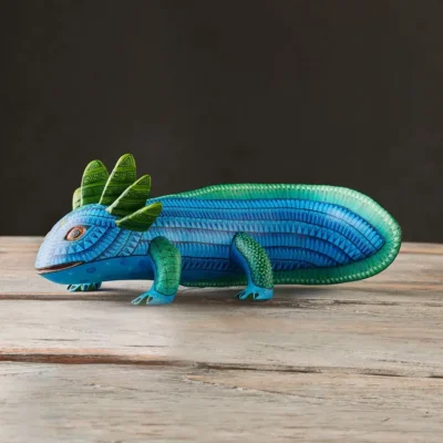 Figura de coyote en madera de copal, pintada en tono verde y trabajada a mano, evocando una estética artesanal de líneas sobrias.